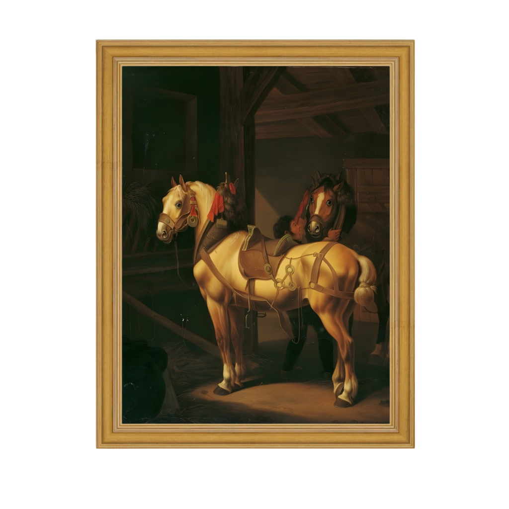 Dois cavalos de tração no estábulo