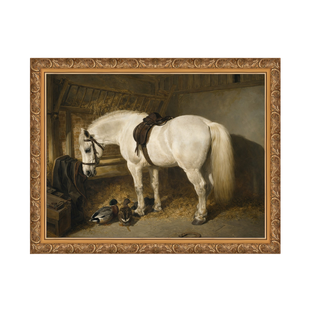 Um pônei cinza em um estábulo com patos